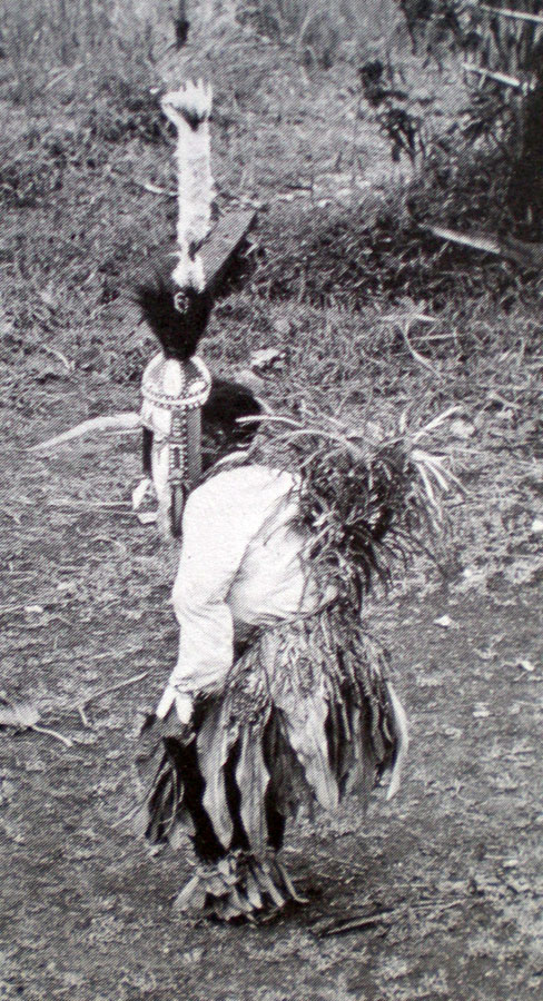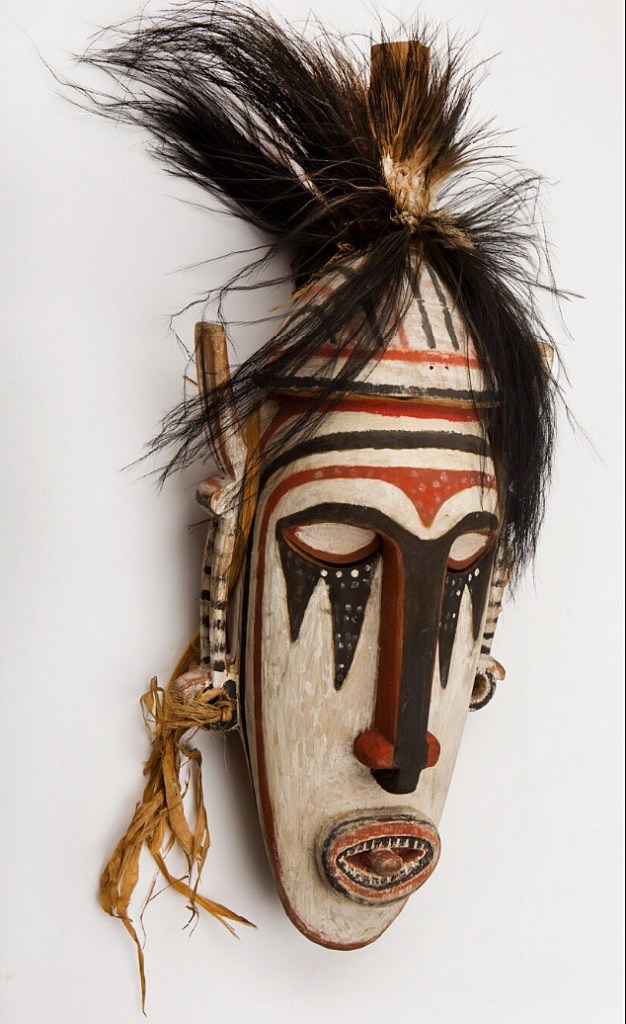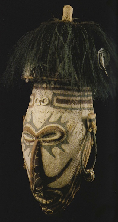 Il s’agit notamment de masques appelés Nausung, peints en blanc, rouge et noir… De forme ovale, sur fond blanc, le nez est long et droit généralement de couleur noire, les yeux possèdent des arcades sourcilières prononcées et sont souvent ornés de triangles noirs posés comme des larmes. La bouche est ouverte et laisse poindre une langue rouge entre des dents noires. Les immenses lobes des oreilles sont détachés du visage, la tête toute entière est coiffée d’une calotte striée en noir, rouge, blanc, surmontée de plumes.