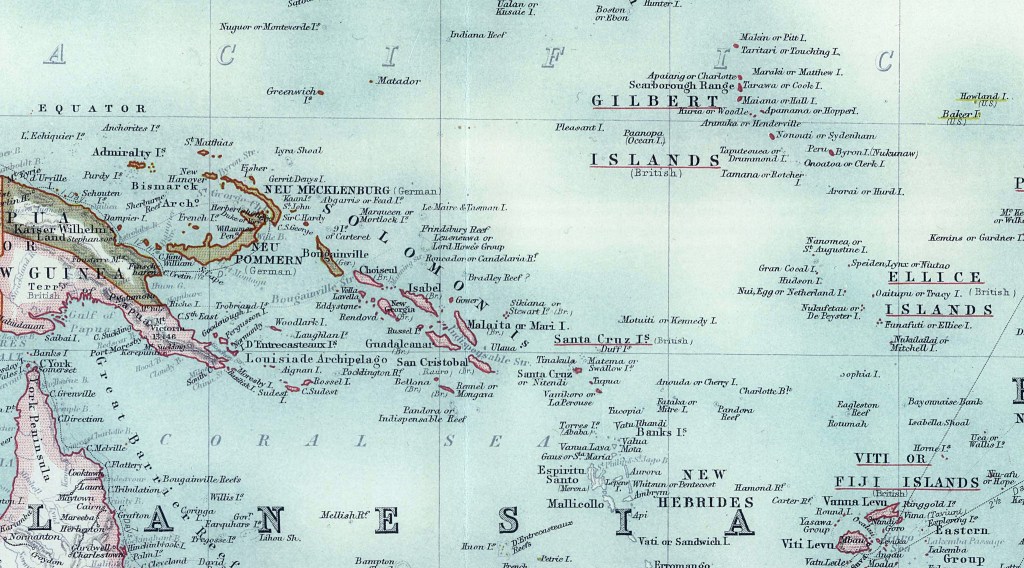 La récente lecture de cet ouvrage est pour moi l’occasion de revenir sur une partie méconnue de ce qu’on appelait les Territoires britanniques du Pacifique occidental, et plus précisément les îles Gilbert et Ellice, et ainsi de se pencher sur l’histoire des collections liées aux 3 voyages effectués par le Royalist entre 1890 et 1893.