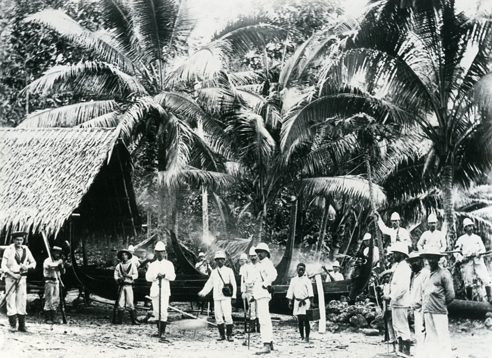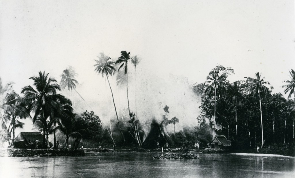 On mesure le tragique des deux photographies qui suivent : Des officiers et des membres d’équipage du HMS Royalist posent à côté de canoës avec des torches allumées, puis le village est en feu.