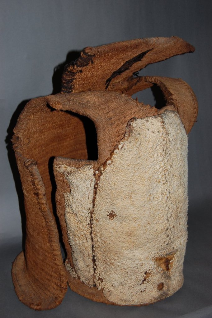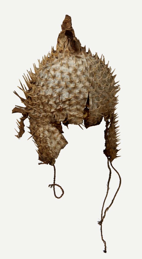 Étonnante armure de fibre de coco, et dont le casque est formé du corps d’un poisson porc-épic. Outre la protection physique que ces imposants accoutrements pouvaient conférer, c’est aussi le lien des matériaux avec l’océan et les entités qui y résident qui rendait ces objets efficaces. Les couteaux affichaient un manche en bois bordé de paires de petites dents de requin de dangerosité terrible pour les tissus humains.