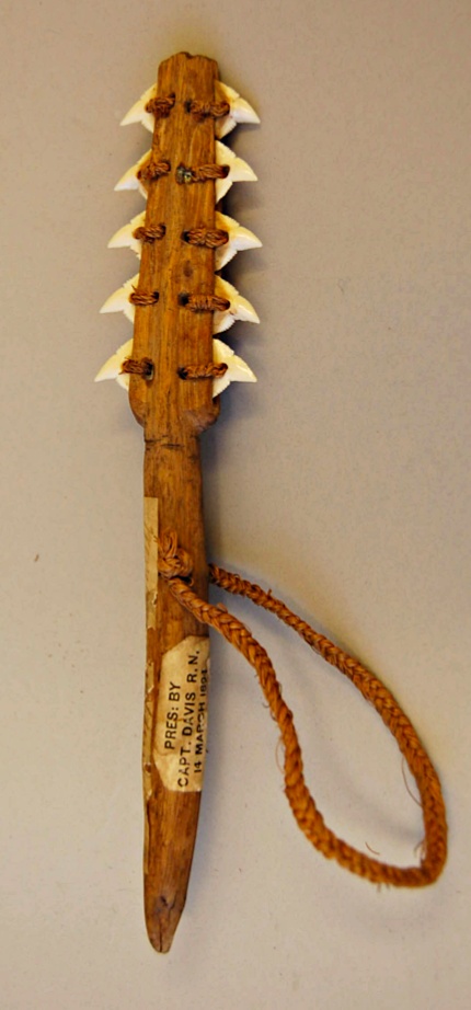 Ainsi débute une série de « planter du drapeau » pour Davis, visitant une à une les 16 îles formant les Gilbert. Il semble qu’il fut bien accueilli par la population locale, un peu moins de la part des Américains qui s’étaient installés là… C’est dans ce contexte que Davis a acquis des objets et a méticuleusement conservé les photographies prises par un membre de son équipage et qui constituent maintenant un précieux témoignage. Sur les 1481 objets de la collection Davis, il y a 561 armes dont une grande partie provient du Vanuatu lors de son escale du 1er voyage. Dans les îles Gilbert, s’il a également acquis des armes, Davis a peut-être réalisé (et les photographies l’attestent) qu’il se trouvait à un moment charnière où les indigènes allaient abandonner les curieuses armures que les guerriers revêtaient afin de régler les conflits (généralement liées à des revendications territoriales ou à des représailles) parce qu’ils allaient entrer dans un monde où la justice serait rendue par la loi britannique…