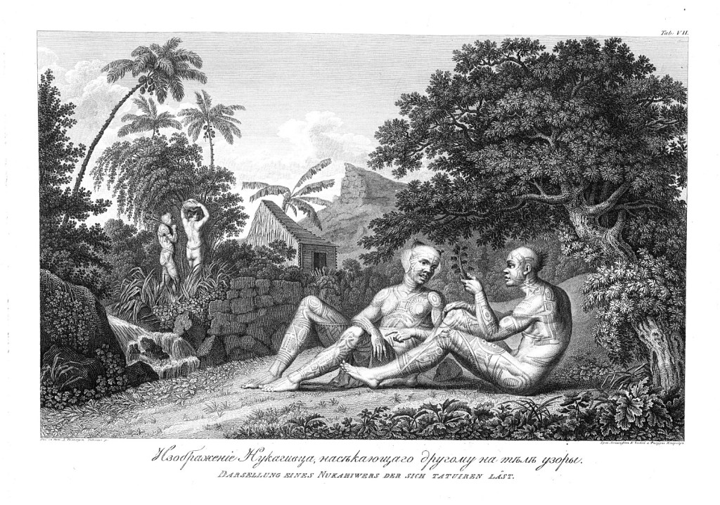 Marquisiens de Nuku Hiva. Gravure de Ignaz Sebastian Klauber, réalisée d’après le dessin de Wilhelm Gottlieb Tilesius von Tilenau, médecin, naturaliste et artiste officiel de l’expédition Krusenstern – 1803-1806.