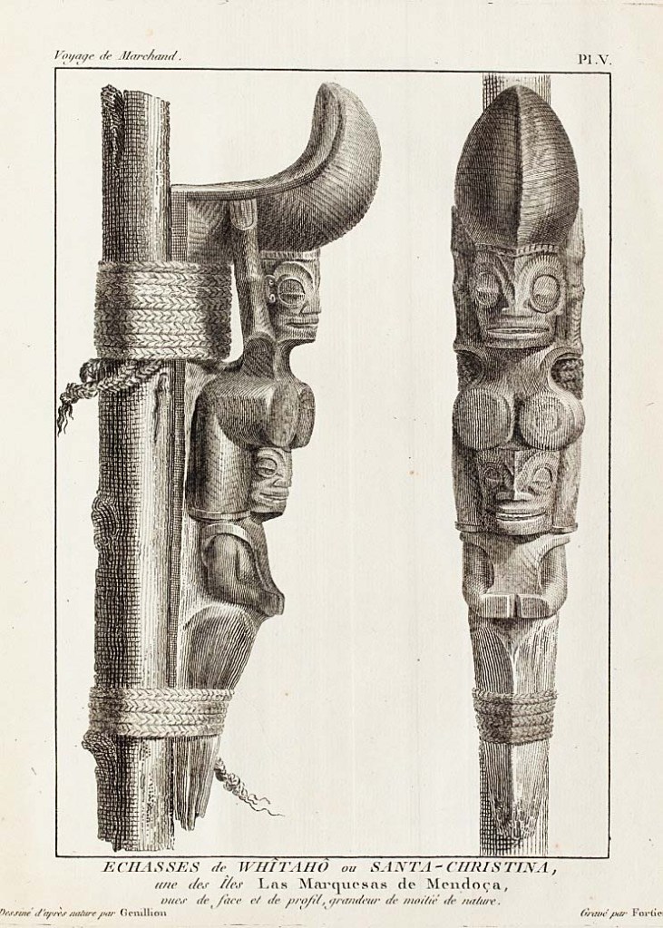 La seule autre image des Marquises publiée en France entre 1798-1800 provient du récit de Fleurieu sur le voyage d’Etienne Marchand autour du monde (1790-1792) et illustre un repose-pied des fameuses échasses marquisiennes (ci-dessous).