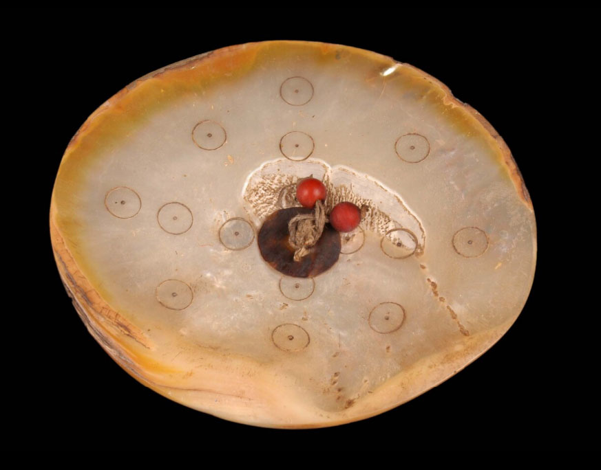 Collection Raffray © Musée du Quai Branly – Jacques Chirac. De gauche à droite : Amulette 71.1878.27.7 – Appuie-nuque 71.1878.27.10 – Nacre 71.1878.27.20 – Récipients à chaux (bambou) : 71.1878.27.19.1 et 71.1878.27.18.1 – Ornement de tête : 71.1878.27.26 – Gourde à chaux (calebasse) 71.1878.27.9 – Cuiller à sagou : 71.1878.27.24 – Poignée en os d’un couteau malais : 71.1878.27.2.1-2.