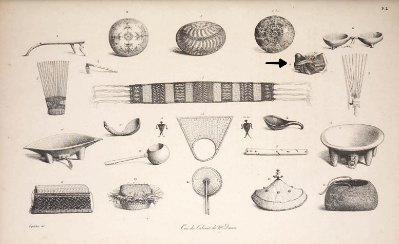 Nous savons qu’un certain nombre des artefacts collectés par La Billardière avait pu se retrouver au muséum d’histoire naturelle à la fin du 18ème siècle. Un indice induit la recherche vers la collection de Vivant Denon : la planche 2 de son Monuments des arts du dessin chez les peuples tant anciens que modernes nous dévoile un sac très semblable (numéro 8 ci-dessous).
