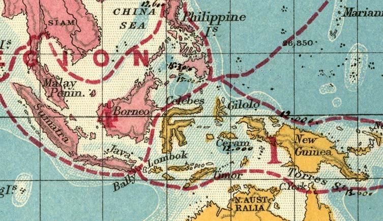 La ligne Wallace, qui se trouve à l’est de Bornéo, marque la frontière entre la vie animale de la région australienne (en jaune) et celle de l’Asie (en rose) © T.D.R.