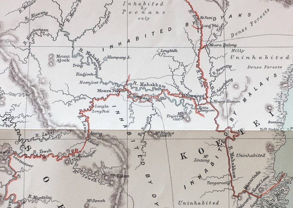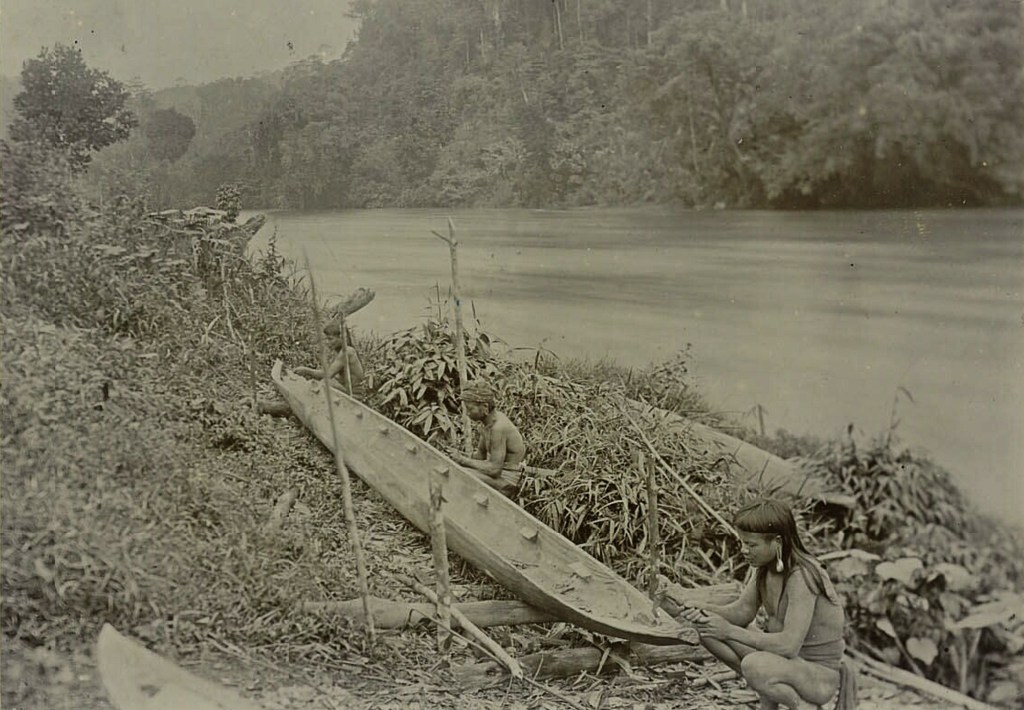 Mi-mai, nous étions prêts pour remonter le fleuve. Il était encore haut malgré la saison sèche. Nous avons suivi les conseils qu’Olmeijer nous avait donnés à Surabaya, car il semblait bien connaître les fleuves de Bornéo et la navigation en général, et nous avons loué un immense prao, près de dix-huit mètres de long comportant une petite cabine extérieure. Nous l’avons fait charger de stocks de vivres et de nos bagages : notre équipage comprenait tout de même une douzaine d’hommes ! Les rameurs se sont vite révélés très efficaces, et nous atteignîmes rapidement la jonction avec un grand affluent, la rivière Telen que nous remontâmes. Il nous importait de parvenir dans ces villages Dayak-Modang en cette saison, car nous savions que c’était l’époque de l’abondance du riz dans les greniers et que fêtes et mariages seraient alors célébrés.