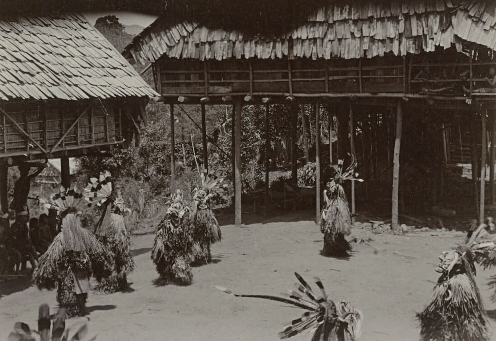 Nous nous arrêtâmes, quittant le bateau et suivant le cortège d’hommes et de femmes excités et joyeux, dans le village de Nehas Liah Bing, là où les villageois avaient souhaité nous conduire. Le chef du village nous accueillit avec la bienveillance qui sied à celui qui cultive l’hospitalité dans le plus grand dénuement. Les jours suivants, les fêtes pour célébrer la récolte de riz commencèrent. Les danses étaient particulièrement spectaculaires : des masques bigarrés couvraient le visage des danseurs dont les corps s’effaçaient sous de lourds costumes de fibres.