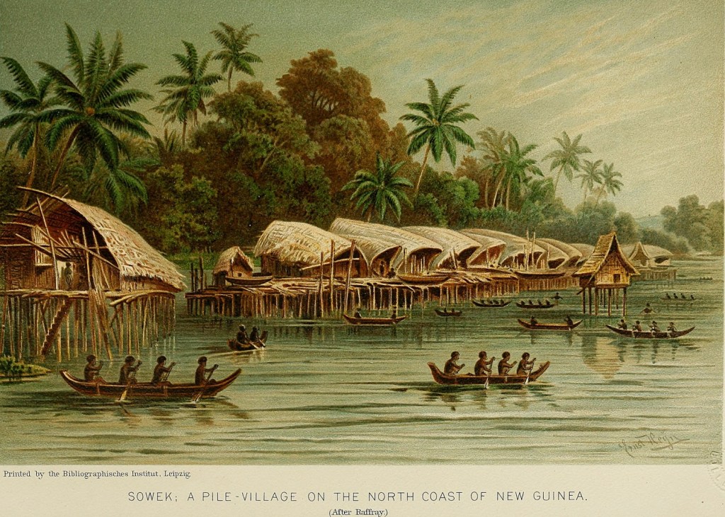 Reposés, confiants dans l’avenir, c’est après quelques jours de mer et de voyage serein que nous avons débarqué à Friedrich Wilhelmshafen (1). Nous étions en mars 1889, plus que jamais décidés à remonter le grand fleuve qui nous conduirait vers l’intérieur du territoire papou et à la rencontre de ces fameux chasseurs de têtes !