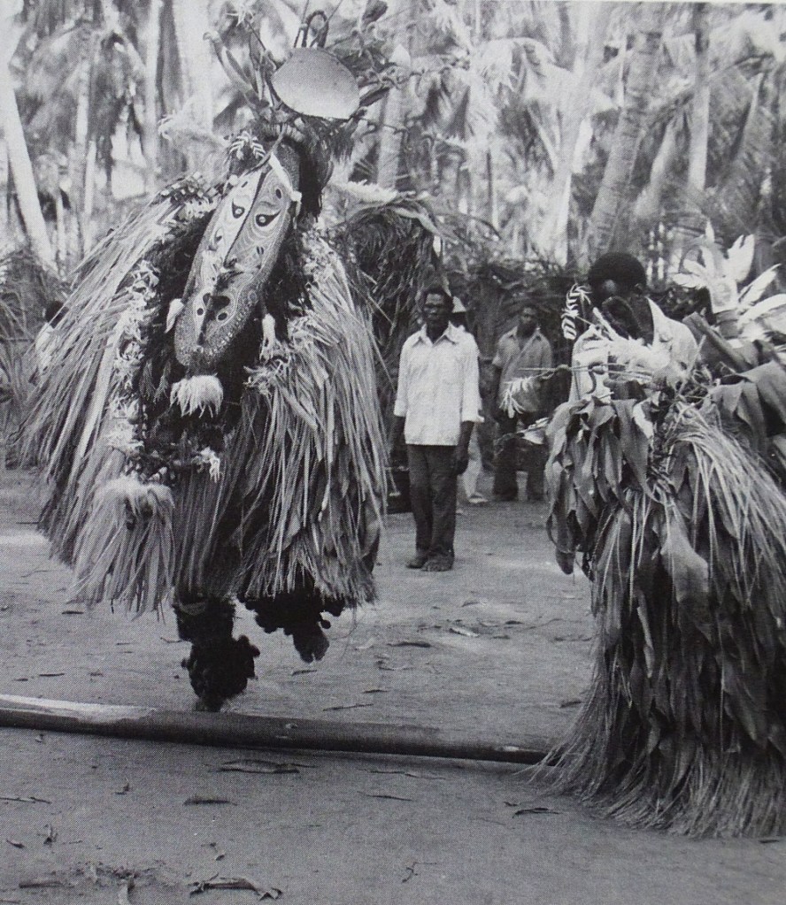 De ces énormes costumes de feuilles montés sur un cône réalisé avec du rotin et de la fibre de coco, émergeait une tête allongée dont on distinguait de prime abord un nez démesurément long recouvert de coquillages et des cauris à la place des orbites des yeux. Les masques dansaient par paires et chantaient probablement en criant dans des résonateurs de bambou que nous ne pouvions voir, mais qui leur conféraient une voix surpuissante ! Les femmes, les plus jeunes, dansaient, elles aussi. Je n’avais jamais rien vu d’aussi impressionnant.