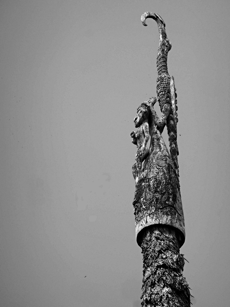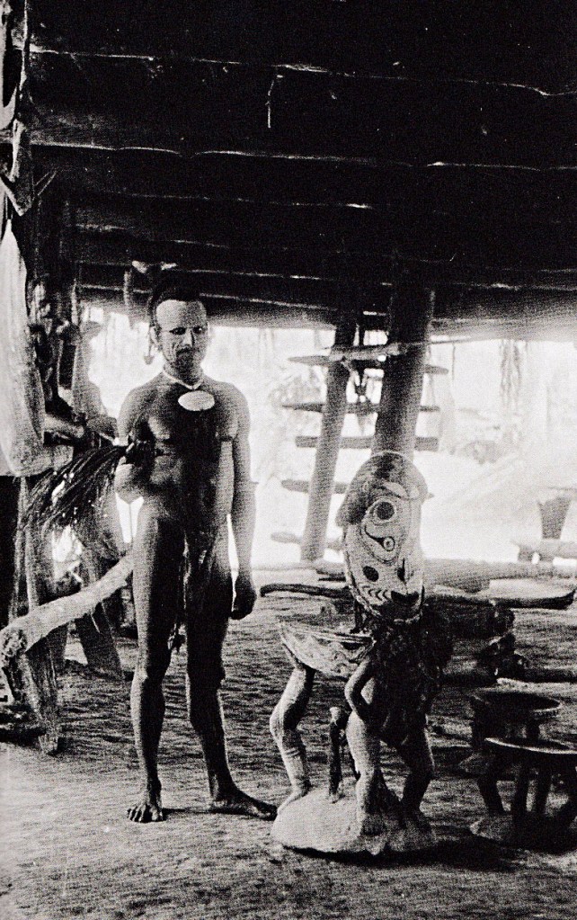 Quant à l’extérieur de la maison des hommes, je le connaissais : il y avait la structure proprement dite avec tous ses piliers sculptés. Je les avais examinés : c’était un entremêlement de vagues ou de corps de crocodiles et de figures qui tiraient une langue démesurée ! Les femmes m’avaient raconté qu’autrefois la Maison des hommes n’était pas soutenue par des poteaux de bois, mais par le corps même des Ancêtres !