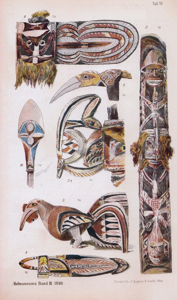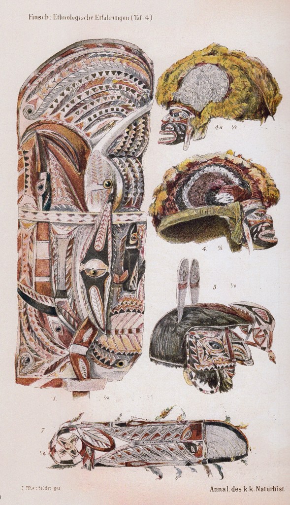 Avant de partir du musée Godeffroy, Luca avait vu arriver ce type d’artefacts, et ce notamment par l’intermédiaire du Capitaine Levison qui patrouillait dans l’Archipel Bismarck et qui s’était installé à la fin des années 70 à Mioko pour travailler pour Godeffroy. À l’époque, quand il les avait reçus, Luca avait été frappé par ces curieux masques, mais ces derniers étaient en très mauvais état, et n’ayant aucune information, il se souvenait les avoir écartés de sa classification… Sa légèreté le rattrapait maintenant, tant il était impressionné par les dessins que Finsch en avait faits.