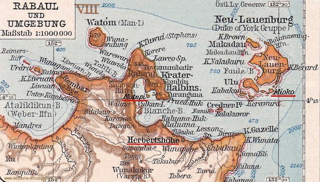 Après nos discussions à Friedrich Wilhemshafen, nous décidâmes d’un commun accord (en réalité « arraché », car Luca était resté sourd à mes réticences) de partir pour la Nouvelle-Bretagne malgré le peu d’argent qui nous restait. Luca attendait beaucoup, peut-être trop, de l’entretien avec Thiel. Le jour du printemps 1894, nous débarquâmes ainsi à Herbertshöhe, toute nouvelle capitale de l’administration coloniale de la Nouvelle-Bretagne.