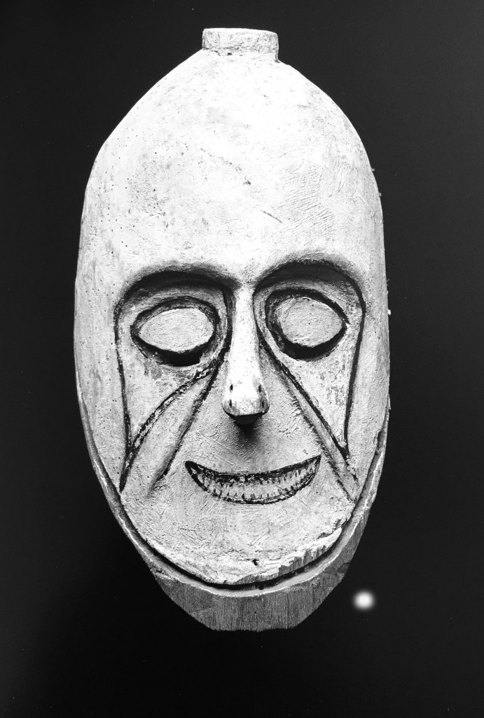 Je fus pétrifiée par ces grands masques et le sourire qu’ils affichaient. Des sourires sardoniques, caustiques ; identiques à l’expression de la petite statue blanche des dessins de Finsch. Ces masques s’appelaient Lor, un mot qui signifiait crâne, et cela interpellait Luca quant à l’importance de ceux-ci dans les croyances de ces peuples. Il se rappelait les paroles de Jouan, convaincu de la force symbolique de la tête parce que siège de l’âme ou du souffle vital.