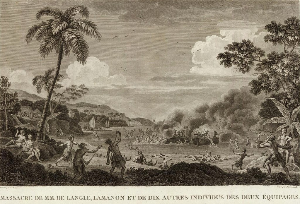 Photo : Massacre de MM. De Langle, Lamanon et de dix autres individus des deux équipages, gravure par Nicolas-Marie Ozanne dans la publication officielle de 1797, La Pérouse [M.M. éd.], 1797: Atlas: Planche 66 sur le site.