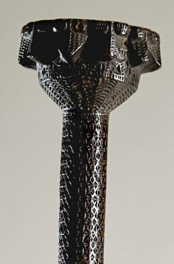 La photographie ci-dessus montre un haut de pagaie inhabituel, plus proche des sculptures qui ornent les manches de chasse-mouches « de prestige ».
