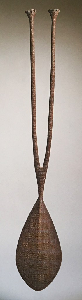 Parmi les curiosités, on remarque encore cette pagaie à double manche, dont on a du mal à cerner sa fonction ou son interprétation.