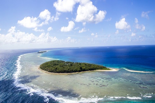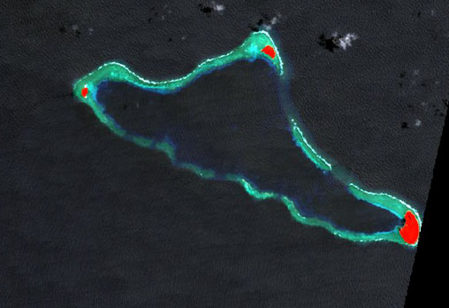 Qui peut se targuer de connaître Lamotrek, un minuscule atoll des îles Carolines en Micronésie ? L’image satellite des 3 îles qui le composent (en rouge) rend compte de la fragilité de ce territoire. Les habitants se concentrent sur l’île principale (en bas à droite de la carte).