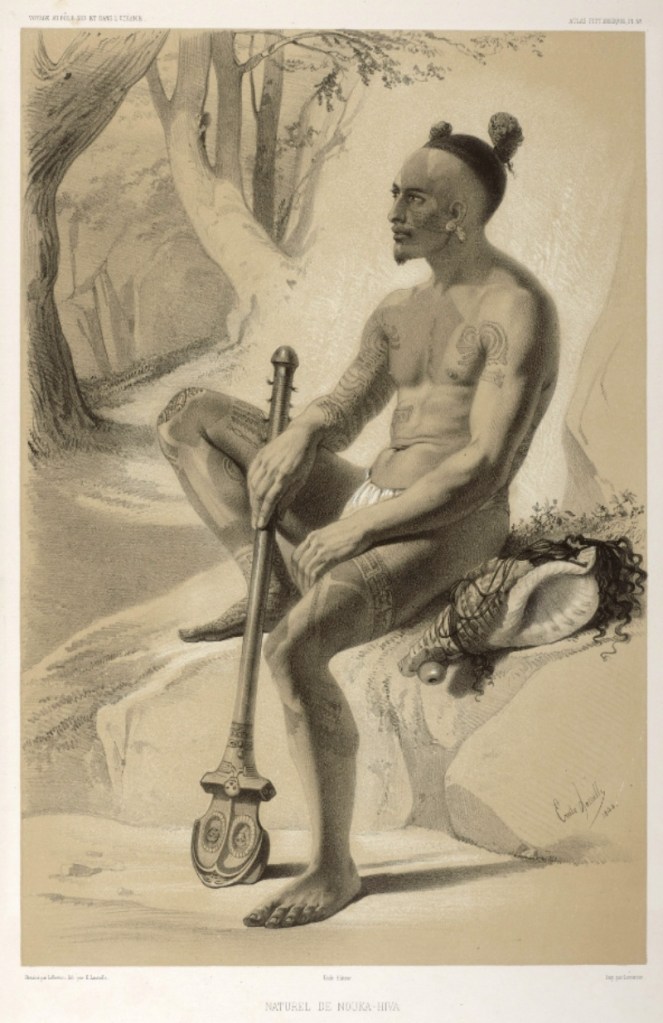 On connait tous cette belle lithographie datée de 1843 et représentant un « Naturel de Huku Hiva » à partir d’un dessin de Louis Le Breton, aide-chirurgien lors de l’expédition de Dumont d’Urville 1837-1840. Lorsque le dessinateur de bord, Ernest Goupil, décède en Tasmanie en 1849, c’est Le Breton, bon coup de crayon, qui a la lourde tâche d’illustrer la fin du voyage.