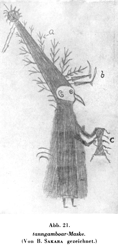 On rapporte souvent ce type de masque au dessin réalisé par de jeunes garçons de l’école de la mission Murik dirigée par le Père Joseph Schmidt. Ce dernier rassembla témoignages et dessins dans un article intitulé « Neue Beiträge zur ethnographie der Nor-Papua (Neuguinea) » et disponible en ligne dans la revue Anhropos Mai-Août 1933.