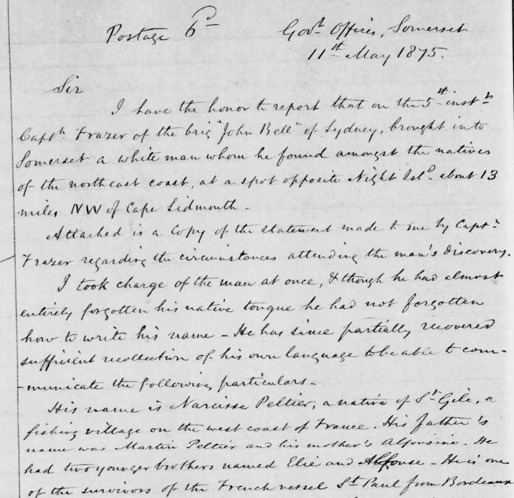 Le 11 avril 1875, Narcisse Pelletier est découvert par hasard par l’équipage du John Bell, vivant parmi les peuples autochtones de la côte nord-est, près du cap Sidmouth. Le capitaine Joseph Frazer l’attira à bord du navire et l’emmena à Somerset, un établissement de la colonie du Queensland.