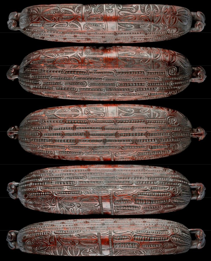 Néanmoins, malgré cette invisibilité, il existe un objet des plus remarquables : Une boîte à trésor maori, aux motifs complexes. Celle-ci est conservée au Museum of London et été le sujet d’un rapport conséquent mis en ligne (92 pages), riche de comparaisons avec des exemplaires d’autres musées. Un document réalisé par Rosamund Currie, Glynn Davis, Catherine Elliott, Umaporn Kruekamwang et Raquel Pinto.