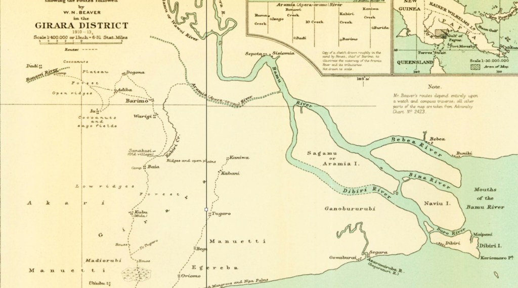 On sait également que W. N. Beaver, un lieutenant australien qui a passé dix années comme officier dans la police armée de Papouasie était en pays Girara, c’est-à-dire la zone située entre la Fly River et la Bamu River (voir carte ci-dessous) dans ces années-là. Il est célèbre pour son ouvrage posthume Unexplored New Guinea paru en 1920.