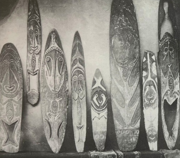 Ces objets ont été collectés par W. Patten en mars 1912 à Goaribari Island – Réf. resp. de haut en bas et de gauche à droite : © Hood Museum 14.13.4285 – 14.13.4281 – 14.13.4280 – 14.13.4269 – 14.13.4272