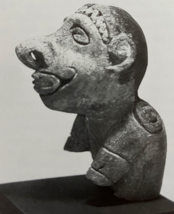 Harry Beran dans son article de 1999, avait recensé 97 sculptures réalisées par Mutuaga. La moitié de cet ensemble est constitué par des spatules dont l’iconographie la plus classique est celle d’un personnage accroupi. Le reste contient des figures anthropomorphes, des bâtons, un bol, un appui-nuque, une massue, un cochon… Parmi eux, j’ai relevé l’étonnante petite tête conservée au Musée des sciences de Buffalo, peut-être utilisée en proue de pirogue…