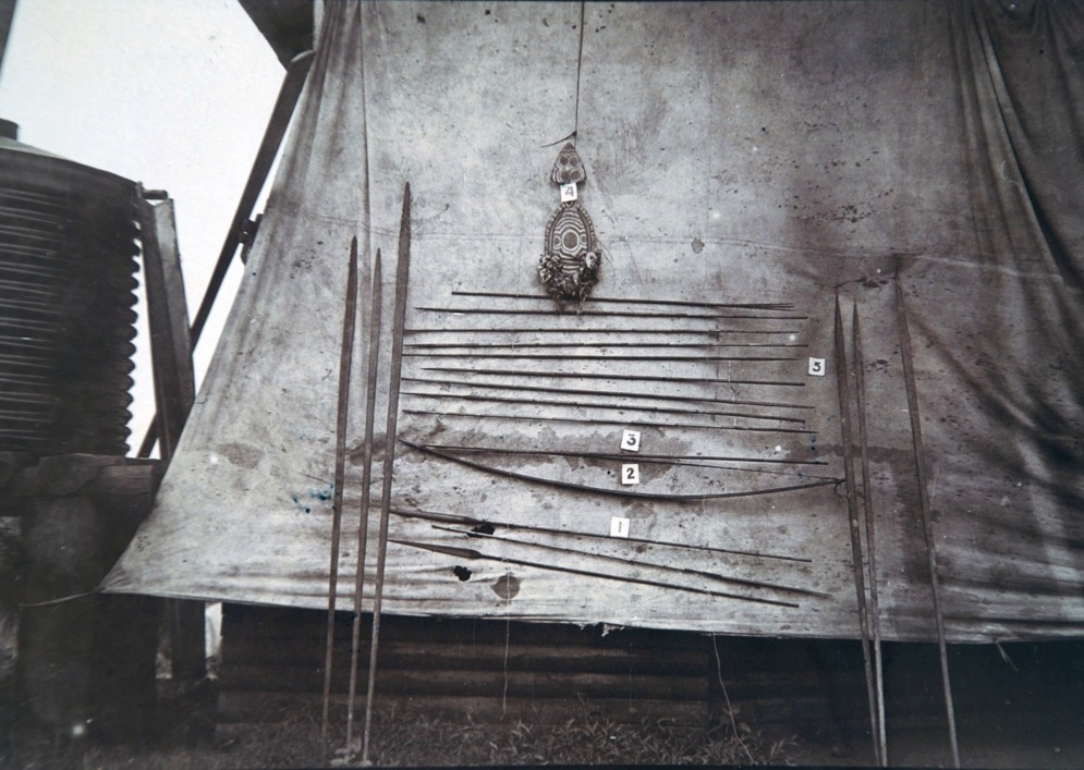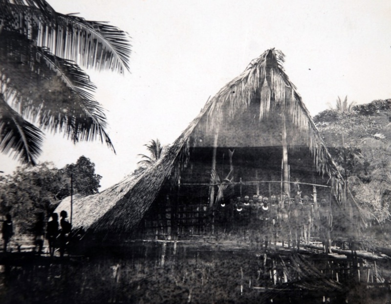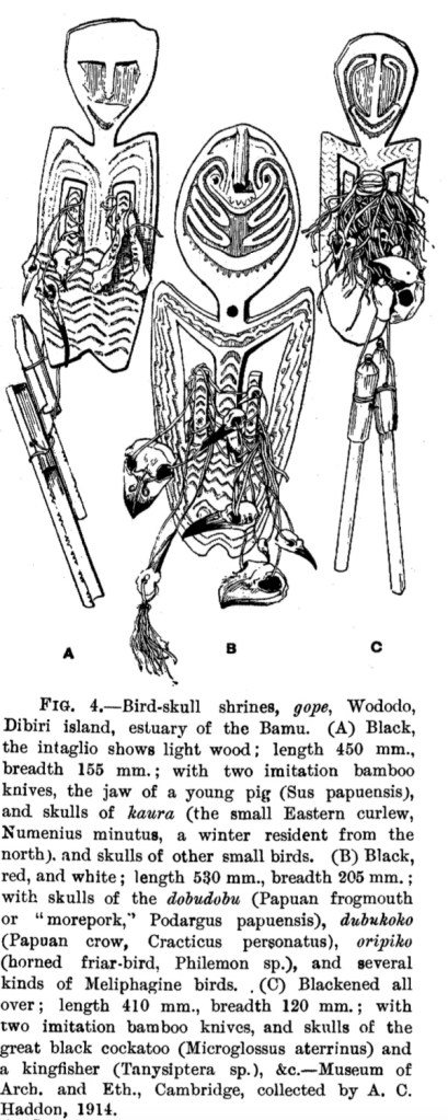 Haddon précise que c’est E. W. P. Chinnery qui lui avait rapporté avoir observé un objet similaire auquel étaient attachés des crânes d’oiseaux, des os de casoars et des squelettes de lézards. Il s’agissait de l’entrée d’une maison longue du village d’Ututi,(peut-être la photographie précédente ?).