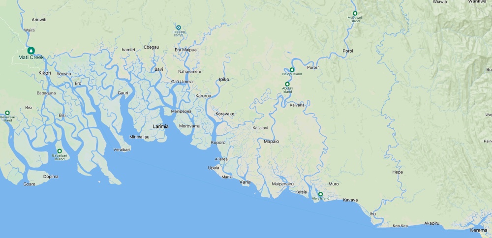 Les deux précédents clichés offrent un aperçu de la région à une époque où seules les patrouilles avaient accès à ces communautés isolées. La seconde photographie a été prise lors d’une patrouille conduite par Chinnery et l’officier W. C. Dudley, entre le 21 et le 27 septembre 1916, à Mati Creek, une zone reculée. Cette mission visait à punir des individus impliqués dans une attaque contre un campement de police locale. Plus tôt la même année, Chinnery avait participé à une autre patrouille traversant la région de Goaribari, au cours de laquelle il mentionne avoir visité le village de Kerewa ainsi qu’une série de villages Urama.