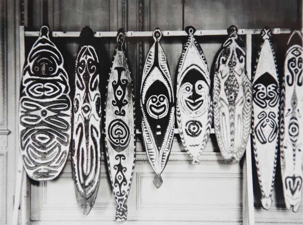 Plusieurs planches ancestrales (koi) montrées in situ dans une maison longue (ci-dessus 1ère photo – P.48397.ACH2) apparaissent dans une autre photographie du musée, prise par H. J. Braunholtz (ci-dessous – P.45458.ACH2) du British Museum.