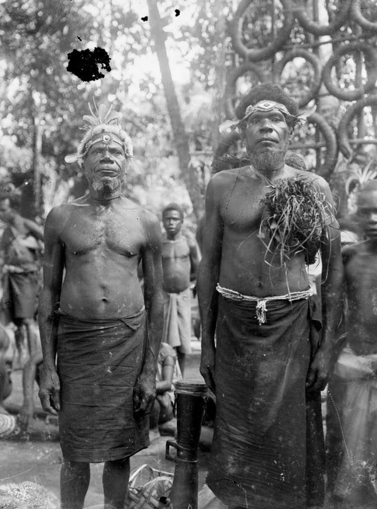 Lorsque j’ai mentionné E.W. Chinnery à propos de photographies du Golfe de Papouasie, je m’étais principalement concentrée sur l’année 1916. J’avais alors omis un épisode majeur de sa vie personnelle : son mariage avec Sarah Johnston Neill en 1919 ! L’année suivante, le couple s’installe d’abord à Melbourne, puis à Port Moresby. Les Chinnery résident en Papouasie jusqu’en 1937, notamment à Rabaul en Nouvelle-Bretagne — alors capitale du Territoire de la Nouvelle-Guinée, administré par l’Australie — jusqu’à ce que l’éruption des volcans Tavurvur et Vulcan ne détruise la ville et les amène à s’installer définitivement en Australie. Entre temps, Sarah possédait un appareil photo et ne craignait pas d’explorer les terres !