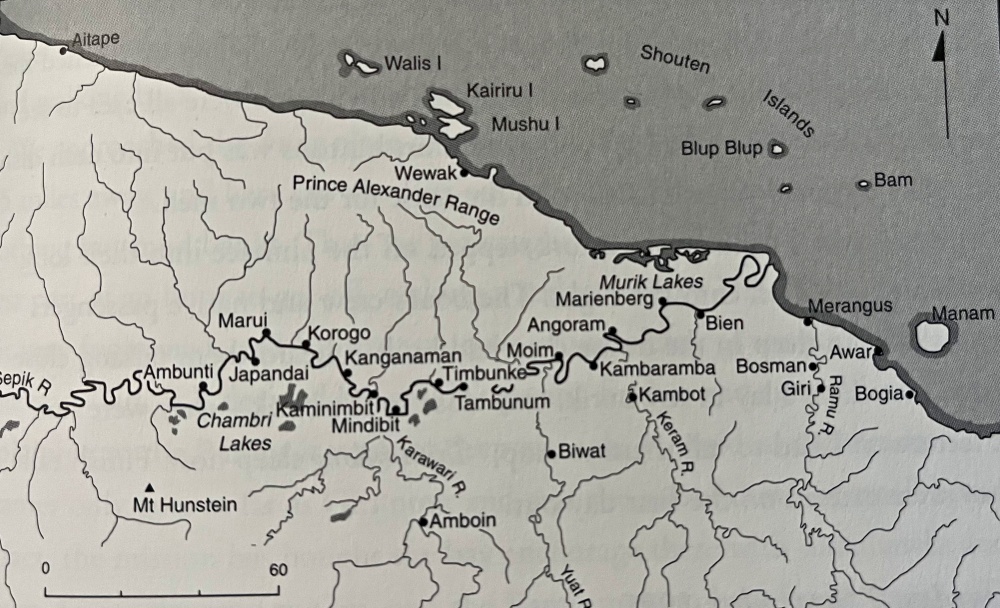 En 1935 on retrouvera Sarah sur le Sepik après avoir séjourné à Awar, un village situé face à l’île de Manam. Elle commencera par remonter la Keram River jusqu’à Kambot, puis reprenant le cours du Sepik, elle parviendra à Ambunti le 22 septembre 1935.