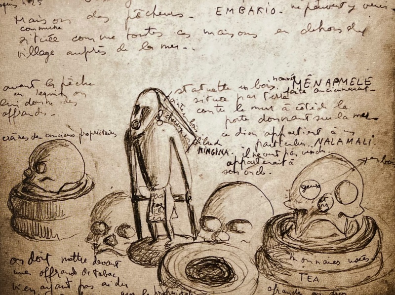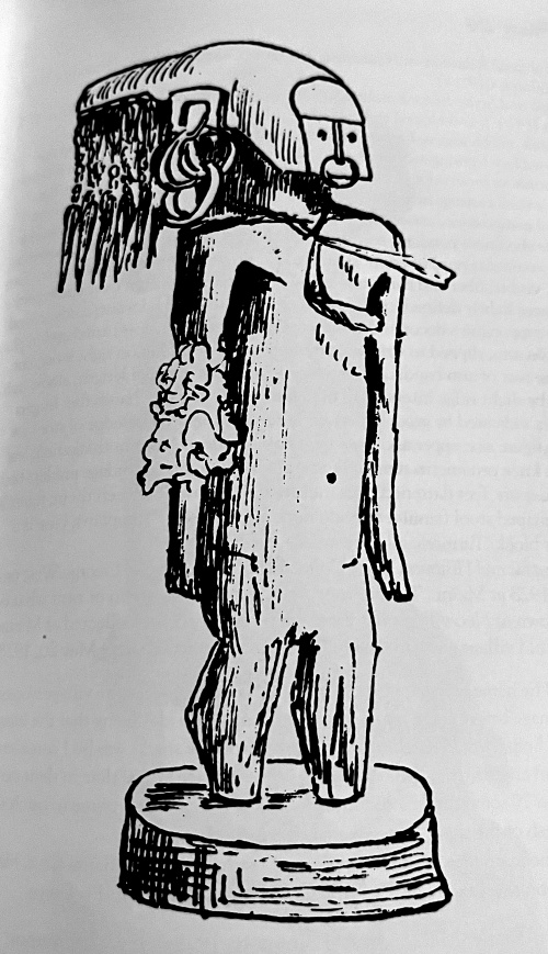 Toujours d’après Davenport, les statues les plus grandes étaient placées sur des autels dans les habitations et les maisons des hommes, posées sur des étagères ou directement sur le sol, entourées de crânes ancestraux, de conques et de rouleaux de monnaies en plumes rouges. (voir le superbe dessin de Régine van den Broek d’Obrenan, ci-après).