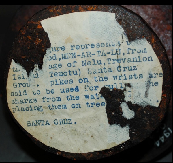 L’étiquette fragmentaire dactylographiée ci-dessus indique : « [figure] représentant le… dieu MEN-AR-TA-LE, du [village] de Nelu, île Trevanion, Temotu, archipel de Santa Cruz. On dit que les pointes sur les poignets servaient à tirer les requins de l’eau et à les placer sur des arbres [sur le rivage] ».