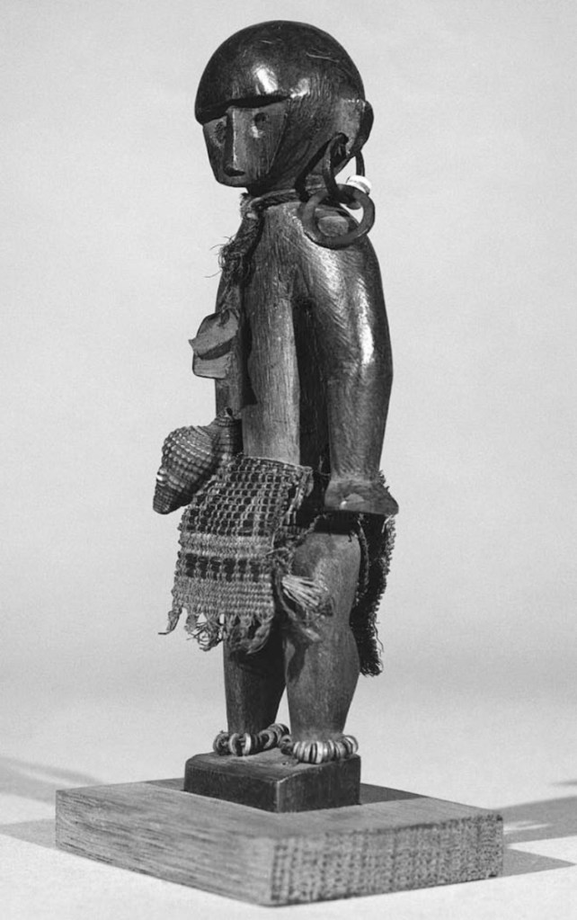 Peu d’informations lui sont directement associées, mais elle correspond sans doute à un type de figurines protectrices. La notice du musée continue ainsi : « Sculptée dans un seul morceau de bois clair et léger, cette statuette présente des formes stylisées. Ses bras sont collés au corps, et les détails (mains, pieds, oreilles) sont simplement soulignés par des incisions. Elle porte un pagne en tissu d’importation imprimé et coloré, décoré de motifs géométriques. Sur le piédestal est gravé un motif stylisé de frégates. Ces oiseaux sont des indices pour les pêcheurs : leur présence indique celle de bancs de poissons et notamment des bonites. »