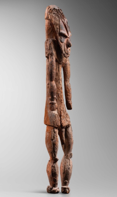Parmi les figures les plus saisissantes, Tamásua, collecté à Maramba, s’impose sans conteste. Haute de 2,10 m, elle se distingue par une morphologie singulière. La tête, inclinée vers l’avant depuis de larges épaules, confère à l’ensemble un léger déséquilibre qui suggère le mouvement. Au sommet du crâne se dresse une forme conique, sans doute destinée à recevoir une coiffe de plumes de casoar. Sur les épaules et le haut des bras, un profond motif de rainures attire l’attention : il évoque un châle sculpté, ou plus probablement la représentation d’un grand bilum.