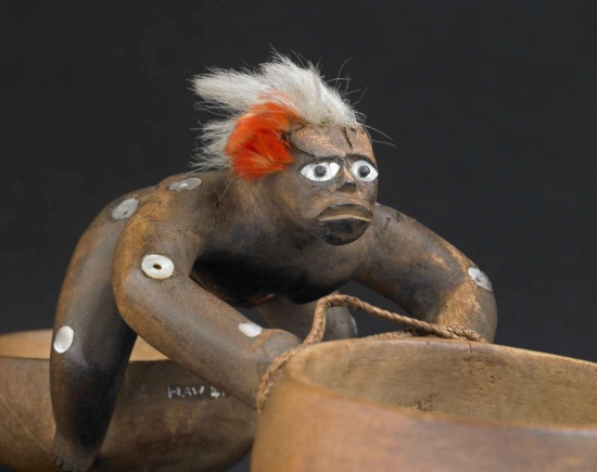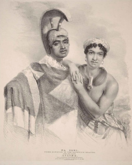 Sur le beau portrait des époux, on remarque le casque mahiole hulu manu du roi mais surtout porté au cou de la belle Liliha, le lei niho palaoa, composé d’une dent de cachalot en forme de crochet et de mèches de cheveux humains, semblable à cet exemplaire conservé au British museum.