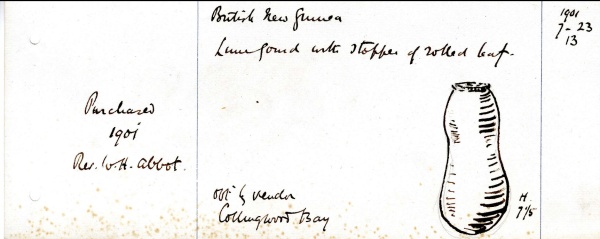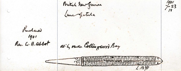 Mais Abbot n’était pas un ethnographe. Aussi n’a-t-il pas produit de descriptions systématiques. Seuls quelques dessins témoignent de ses intérêts pour un pan de la culture matérielle des Maisin. Ses collectes inaugurent pourtant une dynamique qui marquera la région : celle des objets quittant Collingwood Bay pour rejoindre les musées européens.