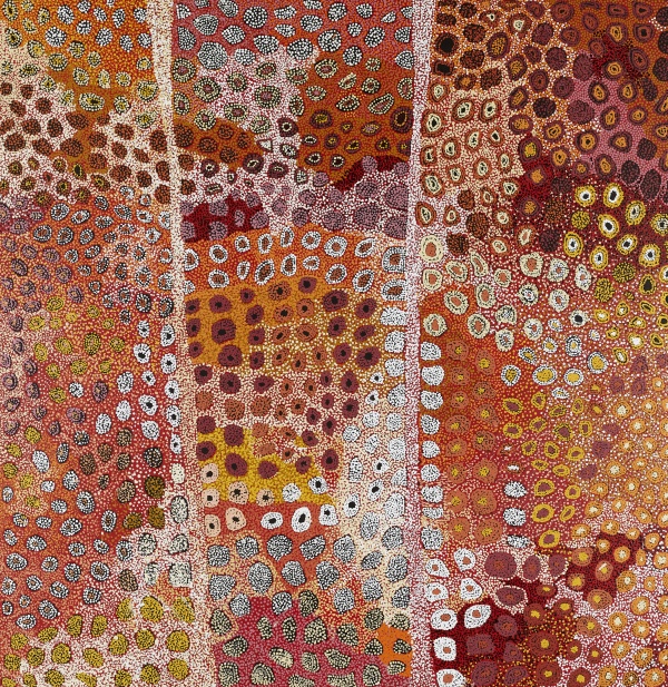 Country – la Terre comme être vivant : Country, c’est une présence, une entité vivante à laquelle on appartient, que l’on soigne, que l’on écoute. Les artistes le disent avec des lignes vibrantes, des points, des hachures, des motifs claniques ou des cartes sensibles du territoire. « Country est perçu comme une présence vivante – un être auquel les personnes appartiennent, tout comme une mère, un ancêtre. »