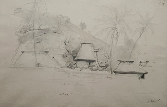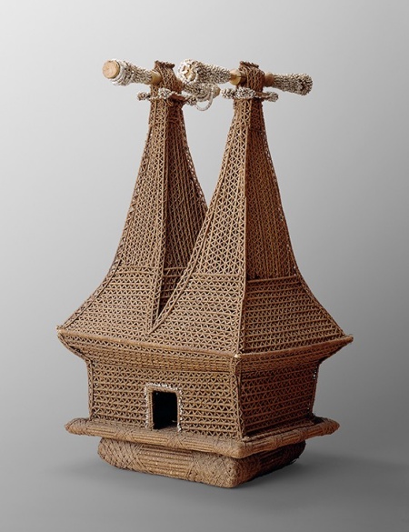 Conçue en collaboration avec le musée du Quai Branly–Jacques Chirac, Fidji 1838. Face à Face réunit les superbes dessins d’Ernest Goupil et une sélection d’objets fidjiens. Parmi eux, ce petit temple en fibres de bourre de coco, mis en regard avec celui que Goupil a représenté au centre du village de Levuka, sur l’île d’Ovalau (à l’est de Viti Levu), dessin aujourd’hui conservé dans le Fonds Bouge (cf-ci-dessous).