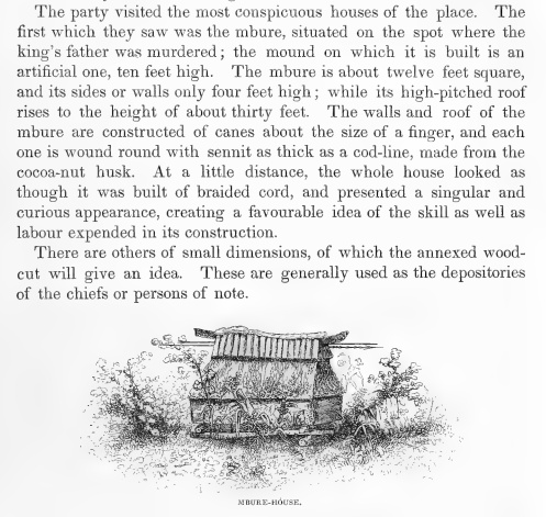 La seule source citée demeure le récit de l’U.S. Exploring Expedition menée de 1838 à 1842 et publiée en 1845 par son commandant, Charles Wilkes. Une version en ligne en permet la consultation ; le volume III (Télécharger) traite du séjour aux Fidji. Wilkes n’en dit guère plus qu’une brève description, précisant que ces constructions « servent généralement de dépôts pour les chefs ou les personnes de distinction ». Il y joint toutefois un dessin représentant l’édifice observé dans le village de Rewa, sur Viti Levu.