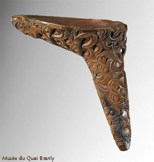 De singuliers objets liés, entre autres, à l'opération de tatouage Moko. Tel cet entonnoir ou korere, jadis utilisé lorsque la personne tatouée devenait « tapu ». La tête étant considérée comme la partie la plus sacrée du corps, et comme le tatouage faisait couler du sang, les artisans tatoueurs, les « tohunga-ta-moko », étaient des... Lire la Suite →
