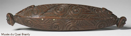 Poursuivant l’étude de quelques oeuvres de l’art Maori, nous sommes frappés par la richesse des décorations de certaines boîtes à couvercles dont les surfaces sont entièrement gravées d'un enchevêtrement de motifs spiralés. Il s'agit en fait de boîte à trésor ou waka huia.Les « trésors » en question que renfermaient ces boîtes étaient des plumes... Lire la Suite →